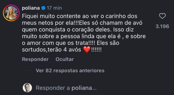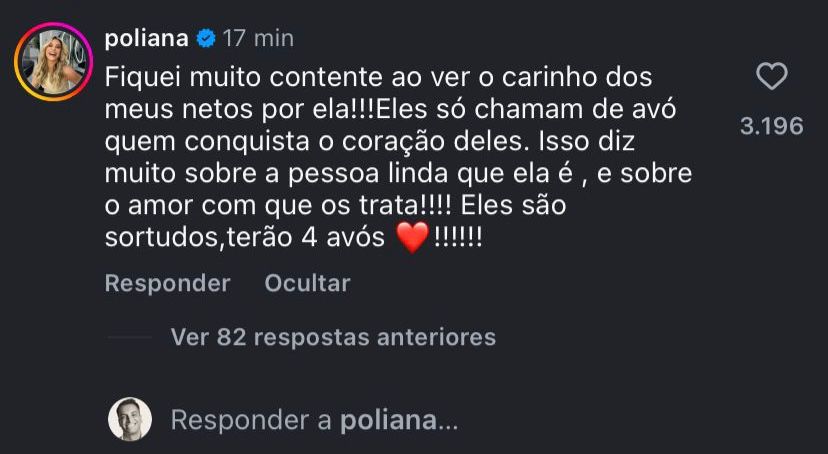 Nos comentários de uma publicação do portal LeoDias, Poliana deixou claro que não se incomodou com a situação e destacou o afeto envolvido. “Fiquei muito contente ao ver o carinho dos meus netos por ela”, escreveu. Segundo a influenciadora, o gesto demonstra a conexão criada com a família. “Eles só chamam de avó quem conquista o coração deles. Isso diz muito sobre a pessoa linda que ela é”, completou.
