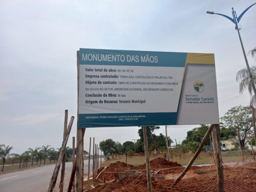 Com recursos do tesouro municipal ao custo de R$ 165.767,09, a Prefeitura de Senador Canedo, constrói em ritmo bastante lento, o Monumento das Mãos na GO – 010, entrada para o Jardim das Oliveiras. O prazo para a conclusão da obra já ultrapassou os 90 dias previstos inicialmente. Alguns moradores das proximidades, afirmam ao portal que o monumento, onde está sendo construído, pode atrapalhar a visão dos motoristas que saem do bairro para pegar a rodovia no sentido Goiânia e Bonfinópolis. Já outros habitantes da localidade acham que o dinheiro gasto na obra seria melhor aplicado na educação. No ar na Terra FM.